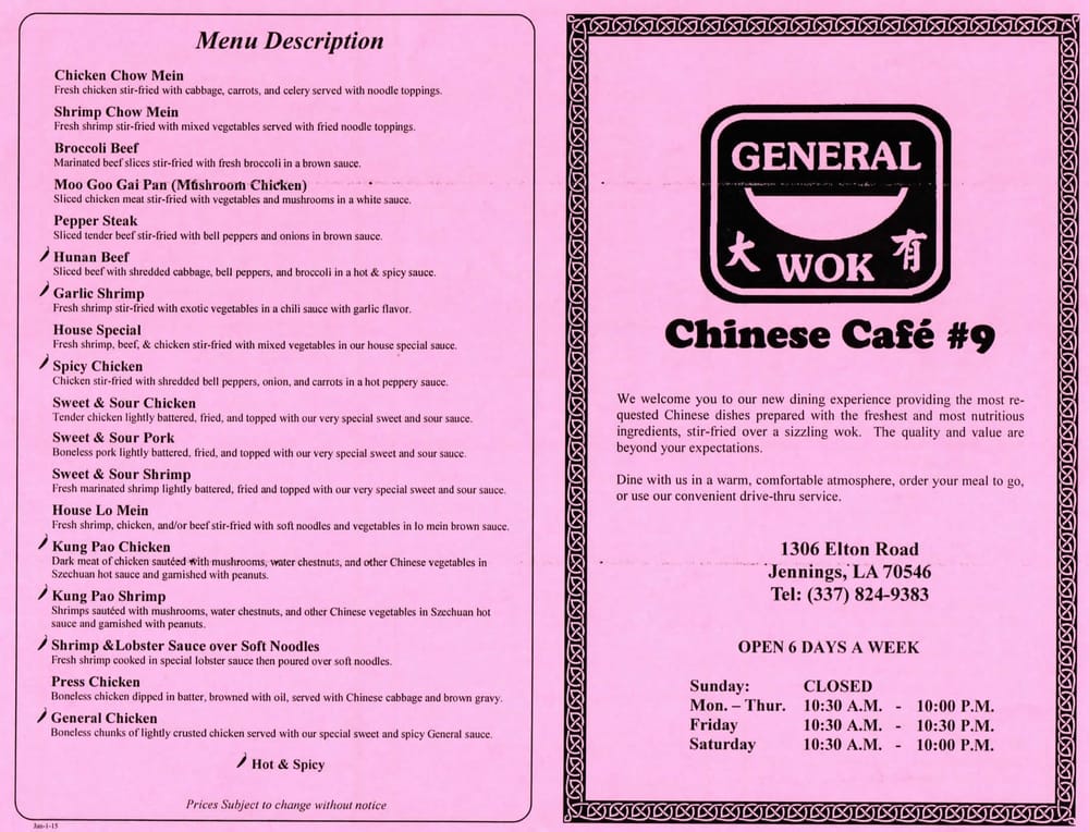 General Wok, located at 1306 Elton Rd in Jennings, LA, is a Chinese restaurant known for its generous portion sizes and flavorful dishes. Customers rave about the Kung Pao Chicken and General Chicken dishes, highlighting the fresh ingredients and friendly service. The menu also offers favorites like Garlic Shrimp, House Lo Mein, and Wonton Soup, all served hot and freshly prepared. While some reviewers mention a slight increase in prices, the overall consensus is positive, with many patrons praising the quality of the food. Whether you're a fan of traditional Chinese cuisine or looking to try something new, General Wok is a must-visit for a satisfying meal in Jennings.