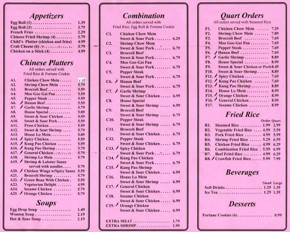 Entree: dumplings au porc et kimchi dumplings au boeuf wagyu soupes won ton rouleaux imperiauxPlats: Nouilles chinoises au porcRiz frit au pouletChow mein au porcLo meinChop suey aux legumesGeneral taoPoulet a l'ananas